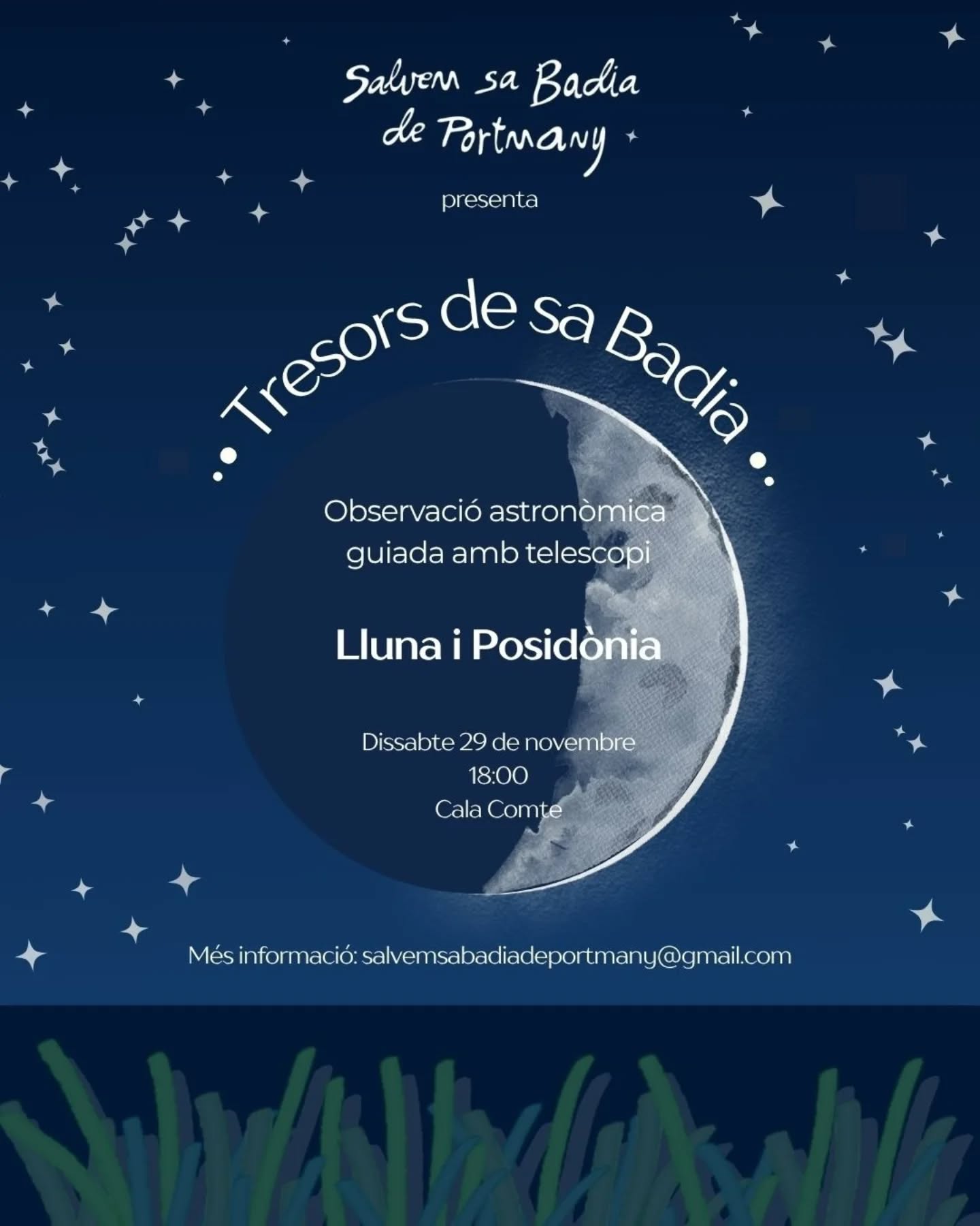El pasado sábado, 29 de noviembre, se celebró en Platges de Comte una nueva jornada de la iniciativa ‘Tresors de sa Badia’, que organiza Salvem sa Badia de Portmany y que está orientada tanto a socios, que pueden disfrutarla de manera gratuita, como a particulares en general. Esta actividad familiar al aire libre, titulada ‘Luna y Posidonia’, consistió en una observación astronómica guiada con telescopio y comenzó sobre las 18 horas, bajo la dirección de la bióloga y monitora Starlight Teresa Marí.